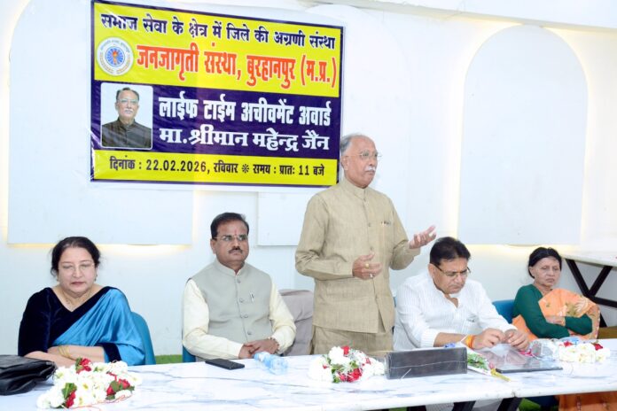बुरहानपुर नि.प्र. – समाज सेवा के क्षेत्र में जिले की अग्रणी संस्था जनजाग्रति संस्था बुरहानपुर द्वारा जिले के एक ऐसे व्यक्तित्व जिन्होंने अपने सम्पूर्ण जीवन को सेवा का स्वरुप देकर ,लक्ष्य बनाकर समर्पित कर दिया हो ऐसे हमारी संस्था के महेंद्र जैन को जो की हमारी संस्था के संरक्षक व् संस्थापक अध्यक्ष होने के साथ साथ जिले की कई समाजिक संस्थाओ , समाजो ,संगठनो एवं कई शासकीय विभागों व जिला विधिक सेवा प्राधिकरण जिला न्यायालय बुरहानपुर एवं कुटुंब न्यायालय बुरहानपुर अपने पदों के अनुरूप अपने दायित्वों का निर्वहन करते हुए समाज को नई दिशा देने में महत्वपूर्ण योगदान दिया है l आपको पूर्व में अनेको पुरस्कार , अवार्ड व् प्रशस्ति पत्र कई संस्थाओ , समाजो , संगठनो व् विभागों द्वारा प्रदत्त किया गया है l आपकी इसी कायशैली ,कुशल नेतृत्व की क्षमता ,कार्य के प्रति ईमानदारी ,समर्पण व् निस्वार्थ भाव से जो आपने सेवा की है इसी फलस्वरूप जनजाग्रति संस्था बुरहानपुर द्वारा इस देश की सबसे बड़ी दो पार्टिया भारतीय जनता पार्टी एवं कोंग्रेस पार्टी के बुरहानपुर भाजपा जिलाध्यक्ष डॉ. मनोज माने एवं बुरहानपुर कोंग्रेस पूर्व जिलाध्यक्ष व् प्रदेश कार्यकारिणी सदस्य अजय रघुंवंशी के करकमलो व् संस्था के समस्त पदाधिकारियों व् सदस्यों की उपस्थिति में लाइफ टाइम अचिव्हमेंट अवार्ड से सम्मानित किया l इस अवसर पर मंच पर संस्था अध्यक्ष डॉ. किरण सिंह ,संरक्षक व् सलाहकार डॉ फौजिया सोडावाला ,कार्यक्रम संयोजक सुनील सलुजा उपस्थित थे l
