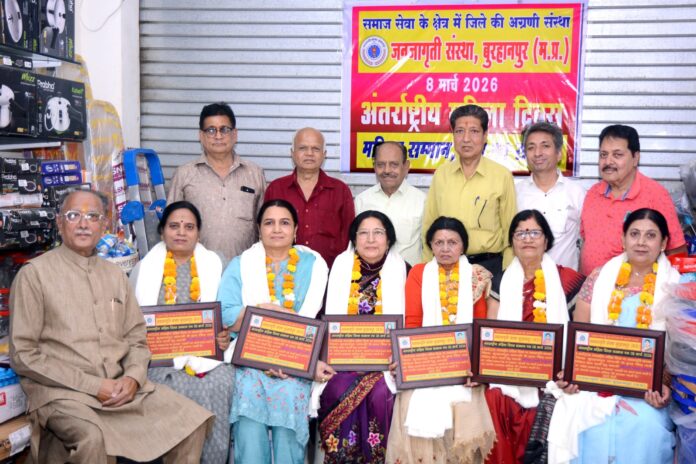 बुरहानपुर नि.प्र. – समाज सेवा के क्षेत्र जिले की अग्रणीय जनजाग्रति संस्था बुरहानपुर द्वारा अंतराष्ट्रीय महिला दिवस के अवसर पर बुरहानपुर जिले के वरिष्ठ समाज सेवी एवं कई सम्मानों से प्राप्त सम्मानित व्यक्तित्व महेंद्र जैन के मुख्य आतिथ्य में व् करकमलो से बुरहानपुर जिले में अपने गृहस्थ जीवन को व्यतीत करने के पश्च्यात सर्व श्री वरिष्ठ समाजसेवी एवं कुशल गृहणी डॉ फौजिया सोडावाला ,वरिष्ठ रिटायर्ड जिला आयुष अधिकारी एवं समाज सेवी डॉ किरण सिंह , कुशल व्यवसायी एवं वरिष्ठ समाज सेवी शोभा चौधरी , महिला किसान एवं वरिष्ठ समाज सेवी सुमेरा अली , वरिष्ठ समाज सेवी कुशल गृहणी रजनी गट्टानी ,सामाजिक कार्यकर्ता एवं कुशल गृहणी आशा तिवारी को जनजाग्रति संस्था बुरहानपुर द्वारा महिला सम्मान देश का सम्मान प्रशस्ति पत्र अवार्ड से सम्मानित किया गया l संस्था द्वारा उपस्थित सदस्यों ने प्रत्येक महिला को सहसम्मान मंच पर आमत्रित कर हार शाल एवं प्रशस्ति पत्र अवार्ड से सम्मानित किया l